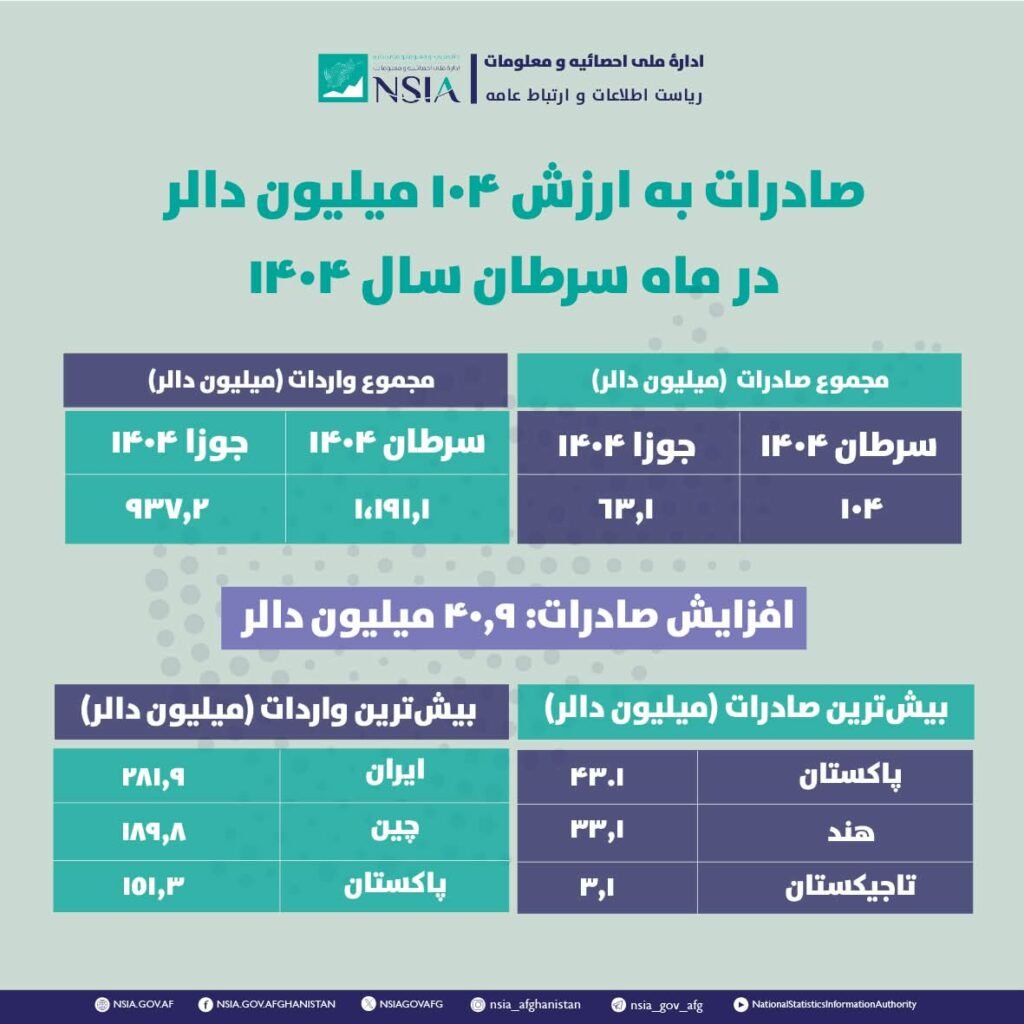 اداره ملی احصائیه و معلومات ارقام مربوط به صادرات و واردات کشور را در ماه سرطان سال ۱۴۰۴ جمعآوری و تحلیل نموده است که مجموع ارزش صادرات در این ماه به ۱۰۴ میلیون دالر و مجموع ارزش واردات به یک میلیارد و ۱۹۱٫۱ میلیون دالر میرسد.