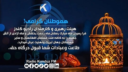 The leadership of Kunduz Radio Network congratulated the arrival of the holy month of Ramadan to the Cafe of the Muslim Ummah in the world and Afghanistan, may your prayers and prayers be accepted by the door of truth.