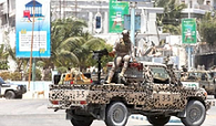 A Somali security officer holds position on their open truck near Syl Hotel, the scene of an al Qaeda-linked al Shabaab group’s attack in Mogadishu, Somalia March 15, 2024. REUTERS/Feisal Omar/File Photo