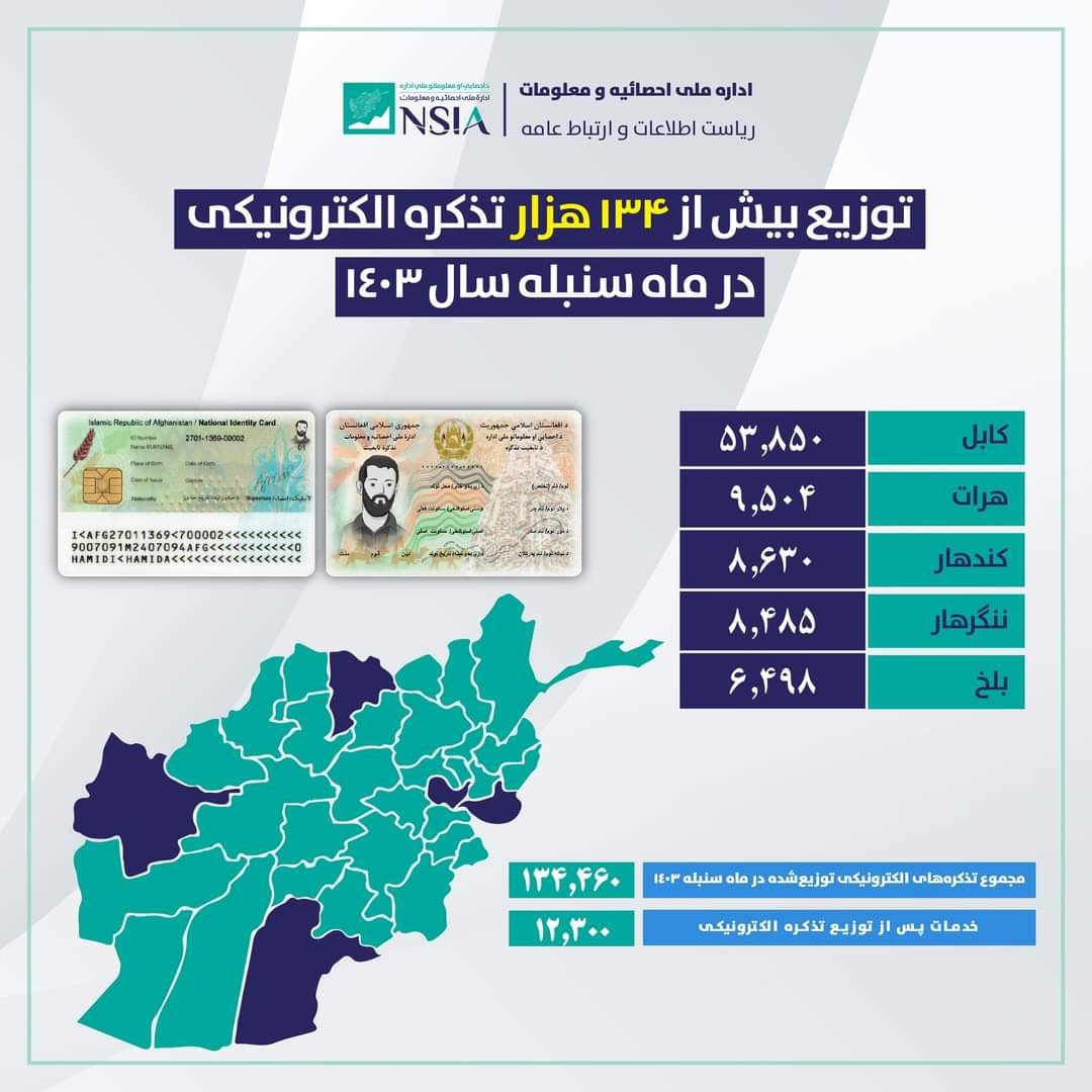 According to the information of the Department of Electronic Tazkira Services of this department, in the leap month of the current year, 53,850 in Kabul, 9,504 in Herat, 8,630 in Kandahar, 8,485 in Nangarhar and 6,000 in Balkh province. 498 are the most distributed electronic identification cards.