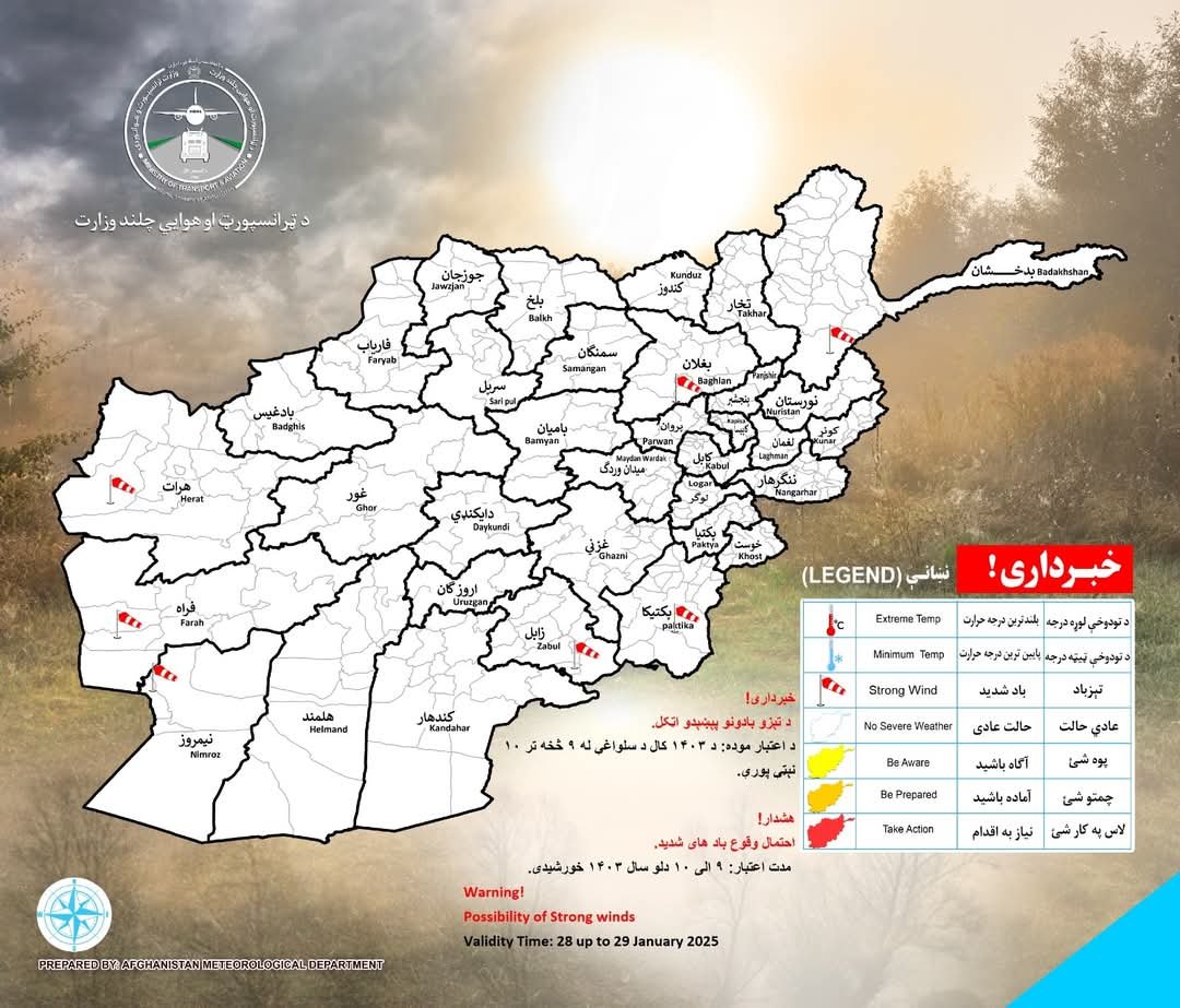 According to an official notice, snowfall and rainfall are expected in Kunar, Nuristan, Laghman, Kapisa, Panjshir, Badakhshan, Takhar, Kunduz, Baghlan, Maidan Wardak, Parwan, Samangan, Bamyan, Balkh, Sar-e-Pul, Ghor, Faryab, Jawzjan, and Badghis provinces.