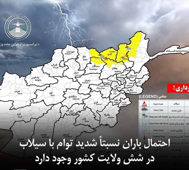 د ترانسپورت او هوايي چلند وزارت د هوا پېژندنې ادارې د یکشنبې په ورځ (د ثور ۱۶) په بدخشان، کندز، تخار، بغلان، سمنګان او بلخ ولایتونو کې د باران او سېلابونو احتمال اعلان کړی دی. په یادو ولایتونو کې د اورښت اندازه له ۱۵ تر ۲۵ ملي مترو پورې اټکل شوې ده.