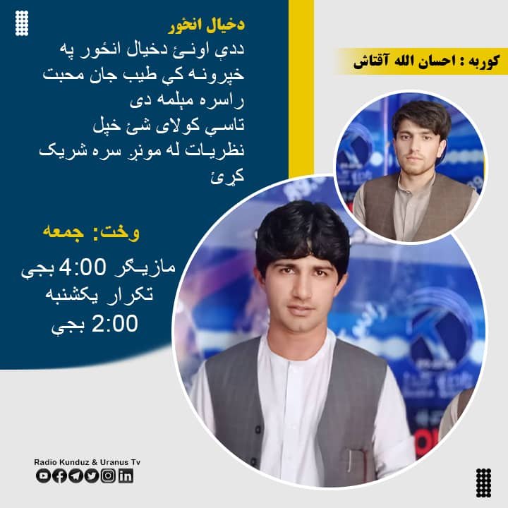 دخيال انځور خپرونه؛ ددې اونۍ دخيال انځورپه خپرونه کې طیب جان محبت مېلمه دی چې دده په شعر اوشاعري خبرې اترې شوي