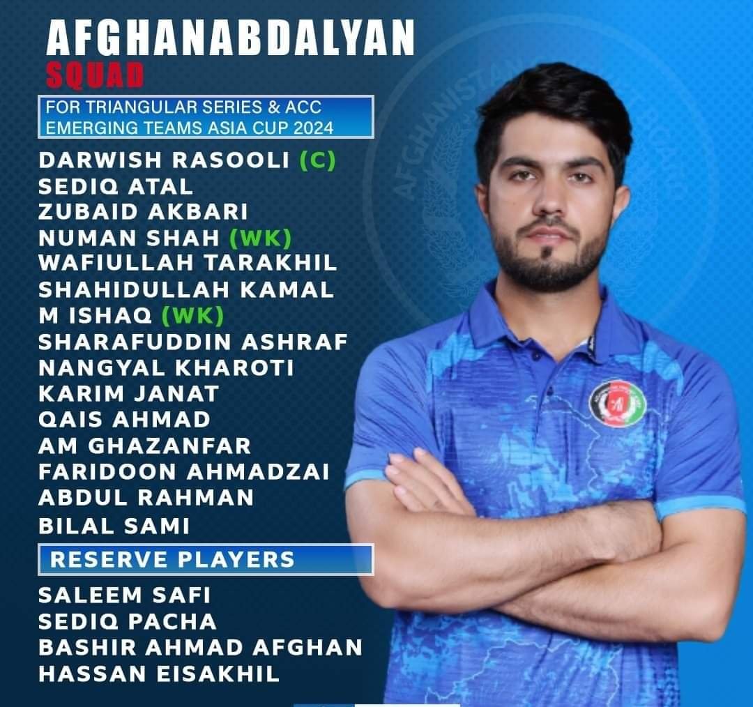 د افغانستان کرېکټ بورډ غوراوي کمېټې ، د عمان په کوربتوب راتلونکې درې اړخیزې لوبلړۍ او د ۲۰۲۴ ایمرجینګ اسیا جام کرېکټ سیالیو ته د درویش رسولي په لوبډلمشرۍ کې د افغانستان الف کرېکټ ملي لوبډله اعلان کړه.