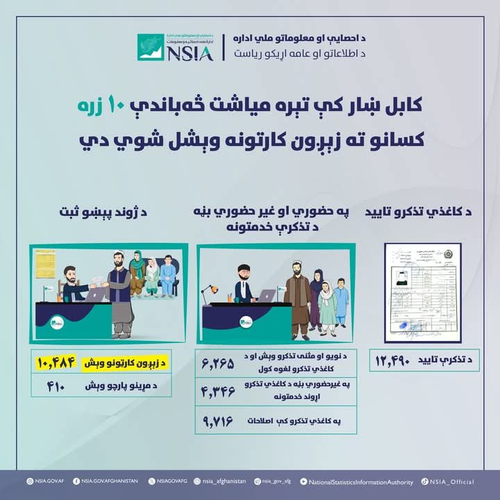 د احصايې او معلوماتو ملي ادارې د نفوسو د احوال ثبتولو خدمتونو ریاست د روان کال په لیندۍ میاشت کې په کابل ښار کې ۱۰ زره او ۴۸۴ کسانو ته زېږون کارتونه وېشلي دي.