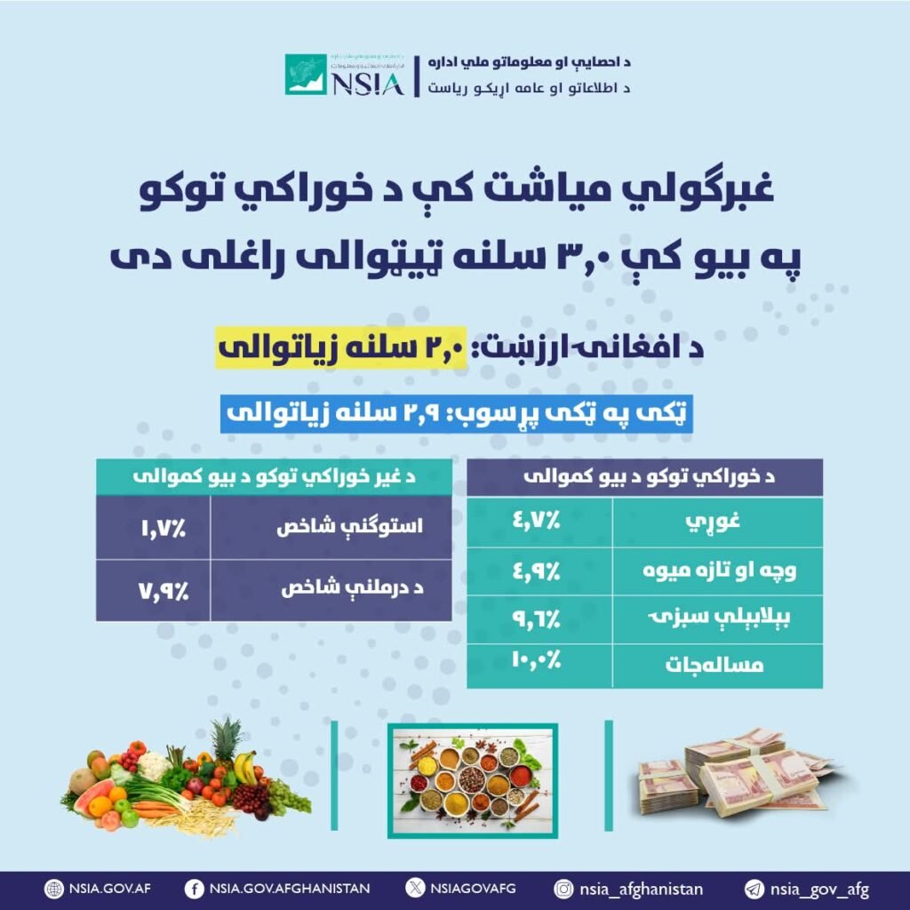 د احصایې او معلوماتو ملي اداره، په میاشتني ډول د لګښتي توکو د بیو ارقام راټول او تحلیلوي، چې لهمخې یې د روان کال په غبرګولي میاشت کې د خوراکي توکو په بیو کې ۳٫۰سلنه ټیټوالی راغلی دی.